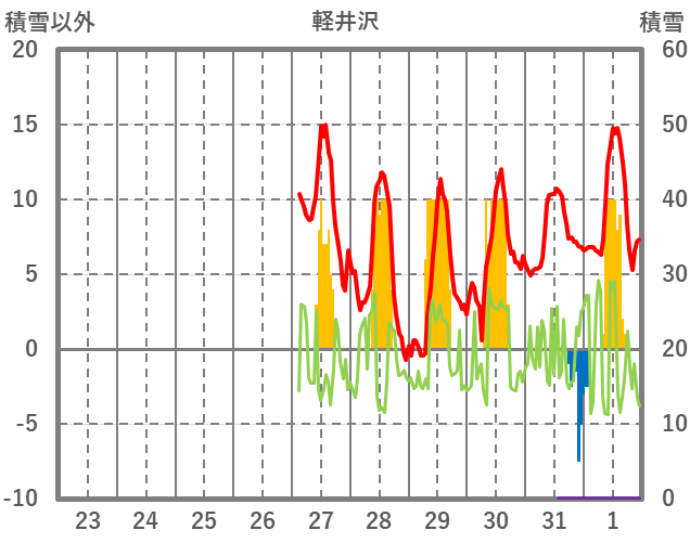 | 日 | 時 | 気温 | 降水 | 風向/風速 | 日照 | 積雪 | 降雪 |