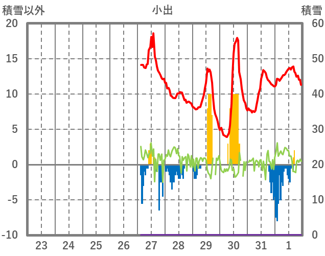 | 日 | 時 | 気温 | 降水 | 風向/風速 | 日照 | 積雪 | 降雪 |