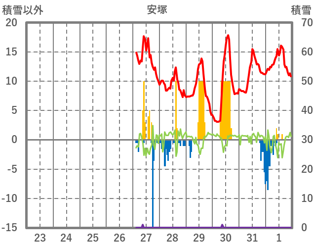 | 日 | 時 | 気温 | 降水 | 風向/風速 | 日照 | 積雪 | 降雪 |