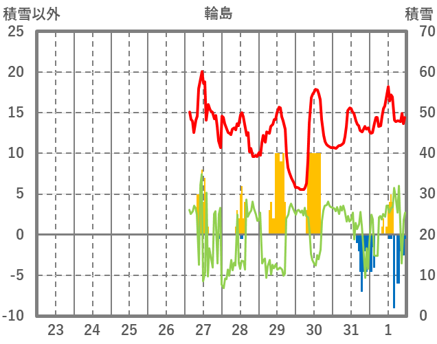 | 日 | 時 | 気温 | 降水 | 風向/風速 | 日照 | 積雪 | 降雪 |