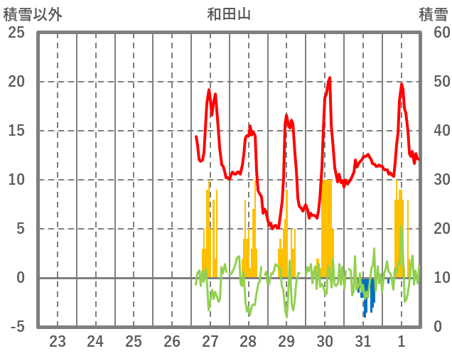 | 日 | 時 | 気温 | 降水 | 風向/風速 | 日照 | 積雪 | 降雪 |
