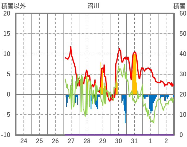 | 日 | 時 | 気温 | 降水 | 風向/風速 | 日照 | 積雪 | 降雪 |
