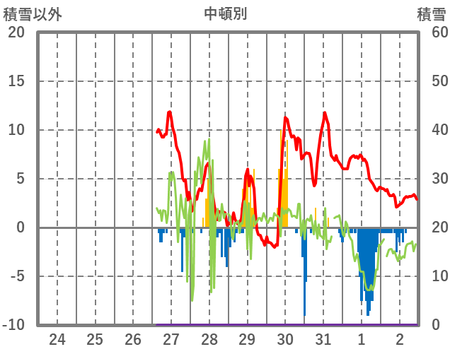 | 日 | 時 | 気温 | 降水 | 風向/風速 | 日照 | 積雪 | 降雪 |