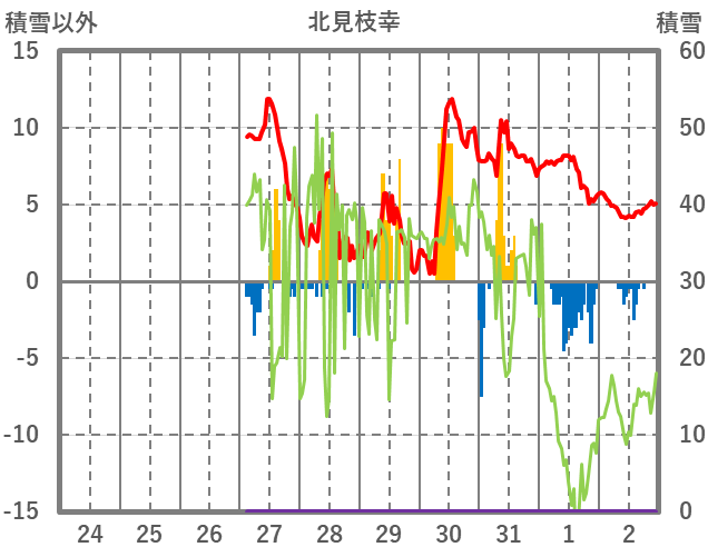 | 日 | 時 | 気温 | 降水 | 風向/風速 | 日照 | 積雪 | 降雪 |