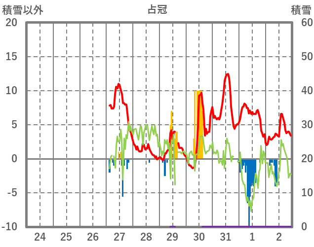 | 日 | 時 | 気温 | 降水 | 風向/風速 | 日照 | 積雪 | 降雪 |