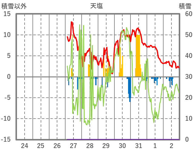 | 日 | 時 | 気温 | 降水 | 風向/風速 | 日照 | 積雪 | 降雪 |