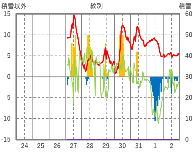 | 日 | 時 | 気温 | 降水 | 風向/風速 | 日照 | 積雪 | 降雪 |