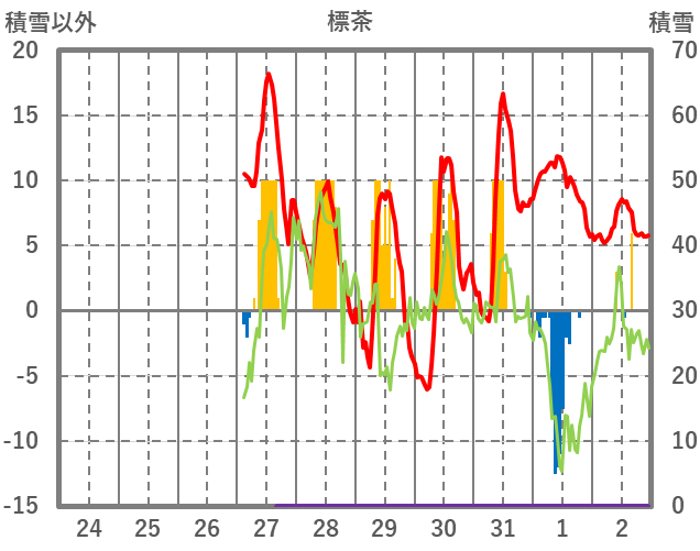 | 日 | 時 | 気温 | 降水 | 風向/風速 | 日照 | 積雪 | 降雪 |