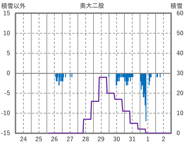 | 日 | 時 | 気温 | 降水 | 風向/風速 | 日照 | 積雪 | 降雪 |