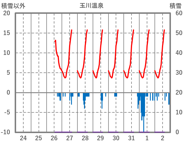 | 日 | 時 | 気温 | 降水 | 風向/風速 | 日照 | 積雪 | 降雪 |