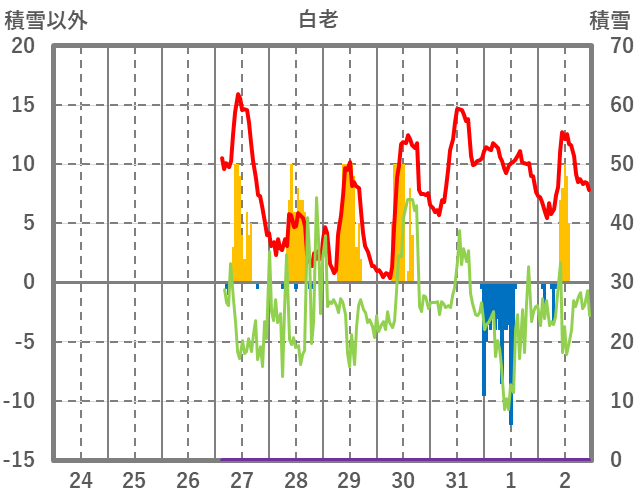 | 日 | 時 | 気温 | 降水 | 風向/風速 | 日照 | 積雪 | 降雪 |