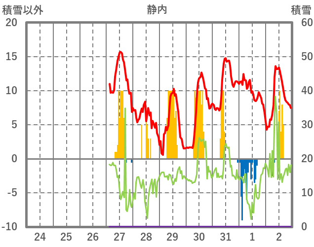 | 日 | 時 | 気温 | 降水 | 風向/風速 | 日照 | 積雪 | 降雪 |