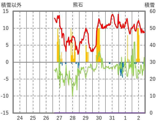 | 日 | 時 | 気温 | 降水 | 風向/風速 | 日照 | 積雪 | 降雪 |