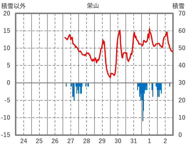 | 日 | 時 | 気温 | 降水 | 風向/風速 | 日照 | 積雪 | 降雪 |