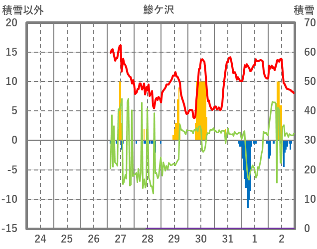 | 日 | 時 | 気温 | 降水 | 風向/風速 | 日照 | 積雪 | 降雪 |
