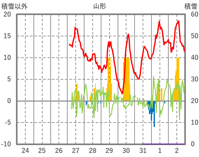 | 日 | 時 | 気温 | 降水 | 風向/風速 | 日照 | 積雪 | 降雪 |