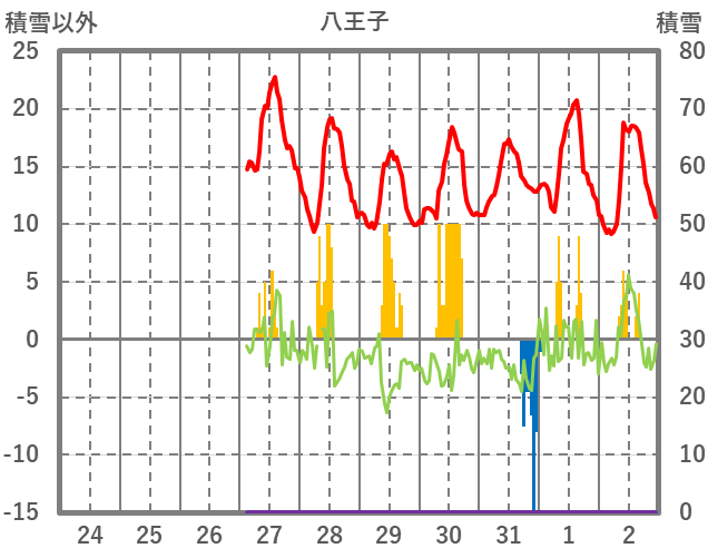 | 日 | 時 | 気温 | 降水 | 風向/風速 | 日照 | 積雪 | 降雪 |