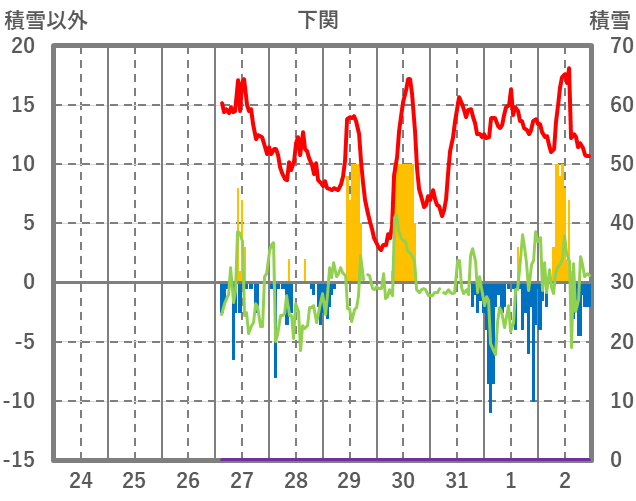 | 日 | 時 | 気温 | 降水 | 風向/風速 | 日照 | 積雪 | 降雪 |