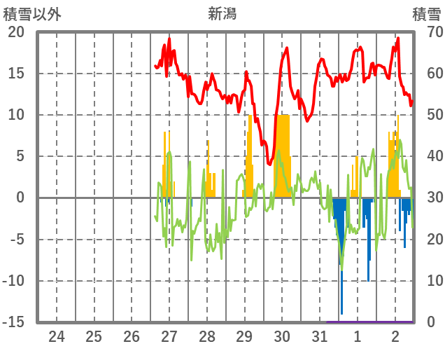 | 日 | 時 | 気温 | 降水 | 風向/風速 | 日照 | 積雪 | 降雪 |