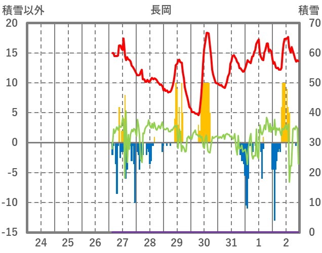 | 日 | 時 | 気温 | 降水 | 風向/風速 | 日照 | 積雪 | 降雪 |