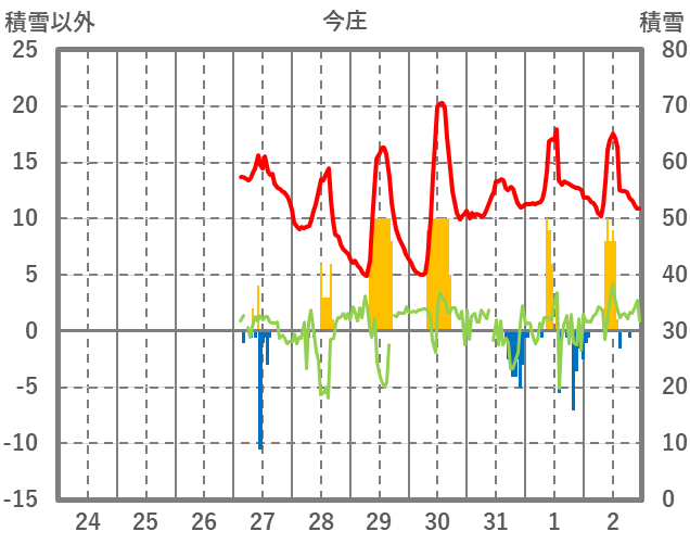 | 日 | 時 | 気温 | 降水 | 風向/風速 | 日照 | 積雪 | 降雪 |