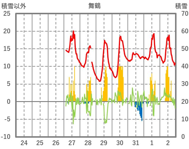 | 日 | 時 | 気温 | 降水 | 風向/風速 | 日照 | 積雪 | 降雪 |