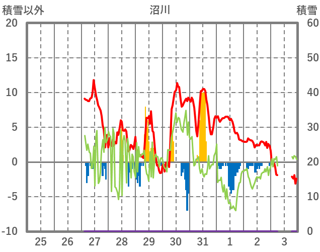 | 日 | 時 | 気温 | 降水 | 風向/風速 | 日照 | 積雪 | 降雪 |