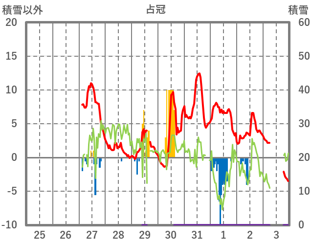 | 日 | 時 | 気温 | 降水 | 風向/風速 | 日照 | 積雪 | 降雪 |