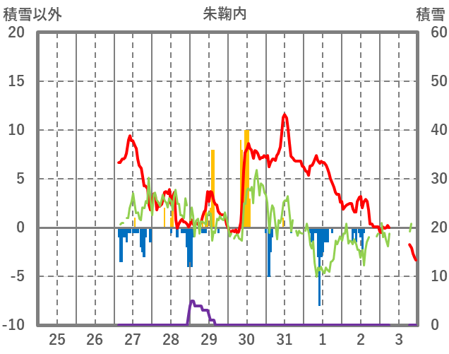 | 日 | 時 | 気温 | 降水 | 風向/風速 | 日照 | 積雪 | 降雪 |