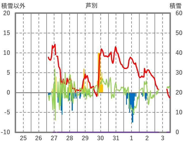 | 日 | 時 | 気温 | 降水 | 風向/風速 | 日照 | 積雪 | 降雪 |