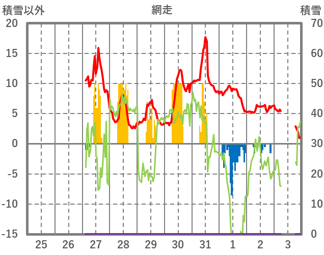 | 日 | 時 | 気温 | 降水 | 風向/風速 | 日照 | 積雪 | 降雪 |