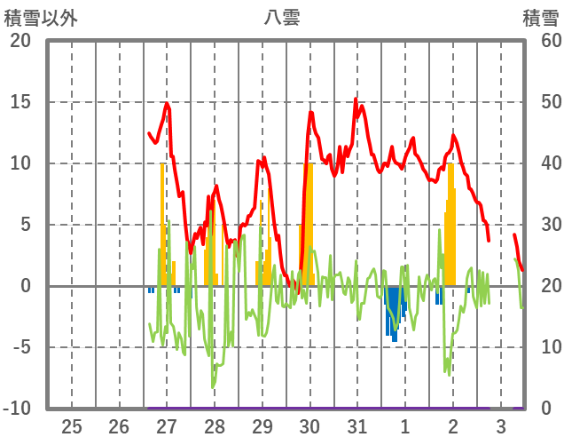 | 日 | 時 | 気温 | 降水 | 風向/風速 | 日照 | 積雪 | 降雪 |