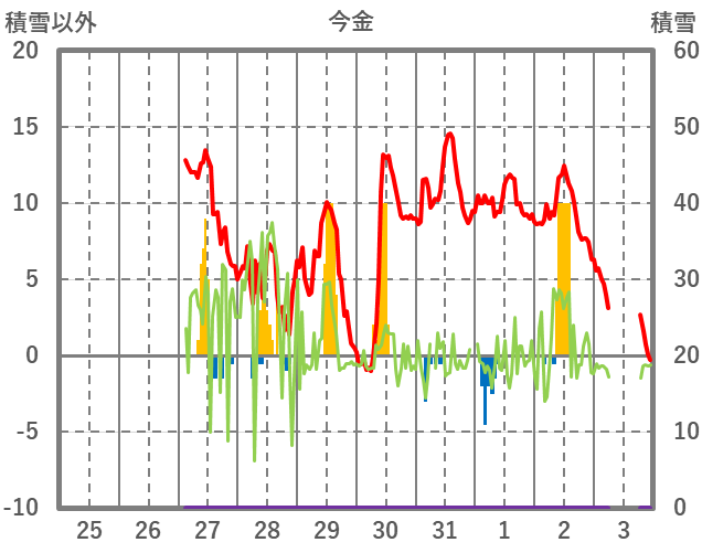 | 日 | 時 | 気温 | 降水 | 風向/風速 | 日照 | 積雪 | 降雪 |