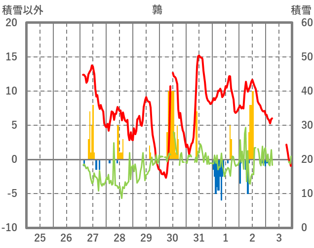 | 日 | 時 | 気温 | 降水 | 風向/風速 | 日照 | 積雪 | 降雪 |