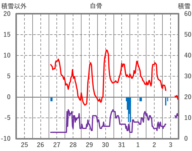 | 日 | 時 | 気温 | 降水 | 風向/風速 | 日照 | 積雪 | 降雪 |