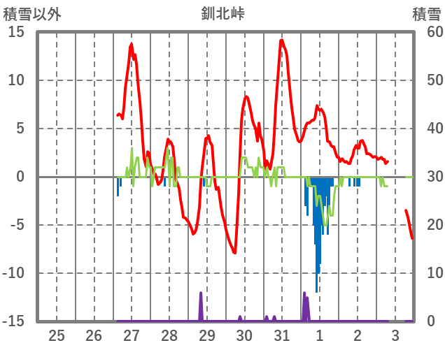 | 日 | 時 | 気温 | 降水 | 風向/風速 | 日照 | 積雪 | 降雪 |