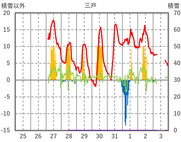 | 日 | 時 | 気温 | 降水 | 風向/風速 | 日照 | 積雪 | 降雪 |