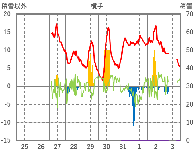 | 日 | 時 | 気温 | 降水 | 風向/風速 | 日照 | 積雪 | 降雪 |