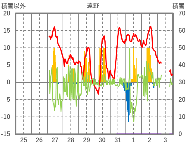 | 日 | 時 | 気温 | 降水 | 風向/風速 | 日照 | 積雪 | 降雪 |