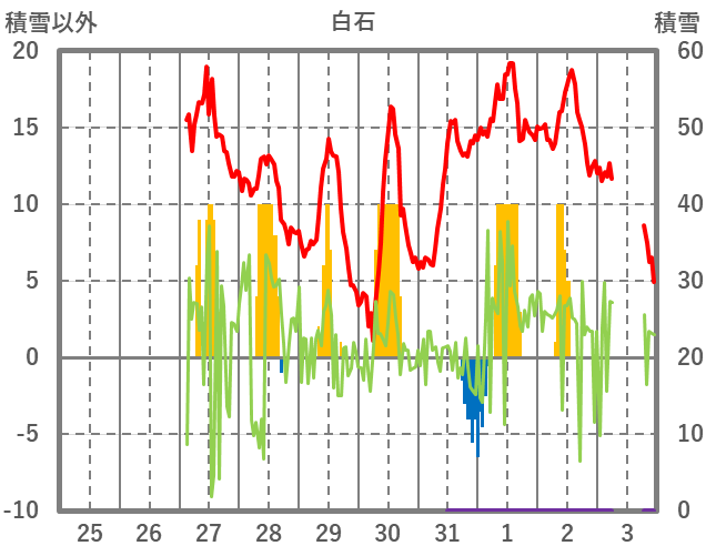 | 日 | 時 | 気温 | 降水 | 風向/風速 | 日照 | 積雪 | 降雪 |