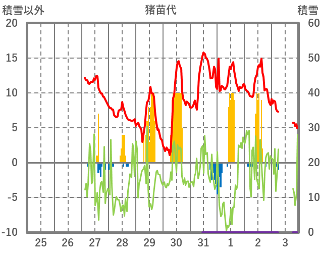 | 日 | 時 | 気温 | 降水 | 風向/風速 | 日照 | 積雪 | 降雪 |
