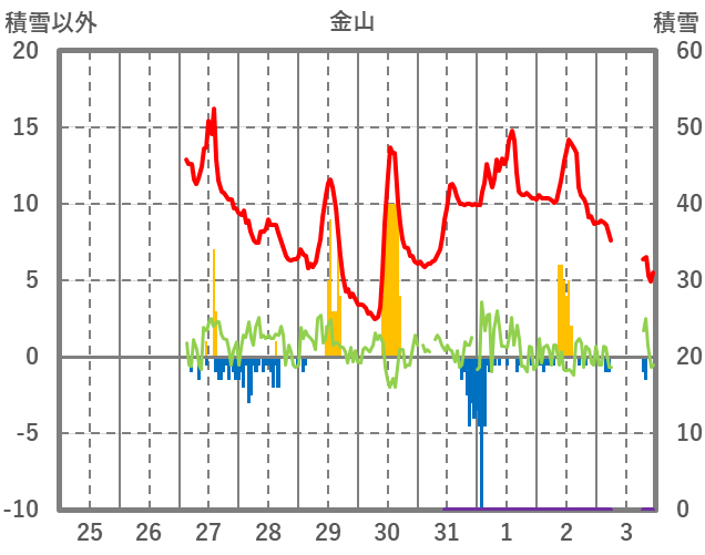 | 日 | 時 | 気温 | 降水 | 風向/風速 | 日照 | 積雪 | 降雪 |