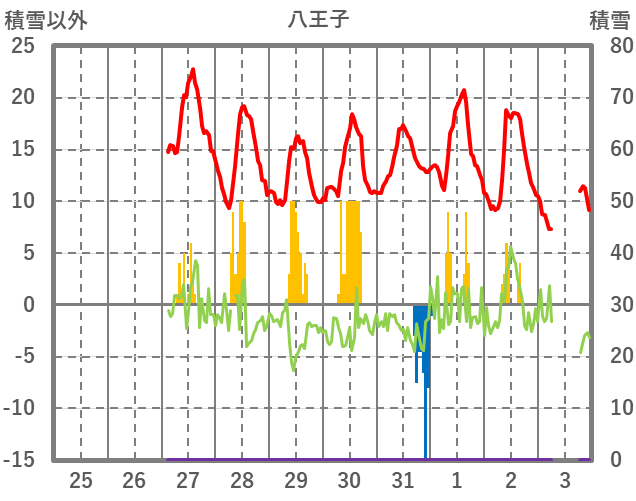 | 日 | 時 | 気温 | 降水 | 風向/風速 | 日照 | 積雪 | 降雪 |