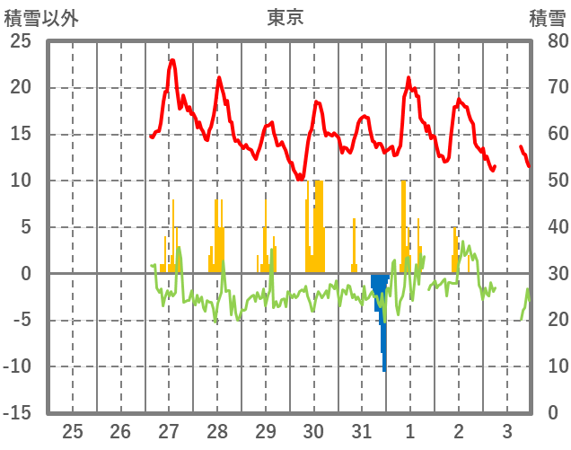 | 日 | 時 | 気温 | 降水 | 風向/風速 | 日照 | 積雪 | 降雪 |
