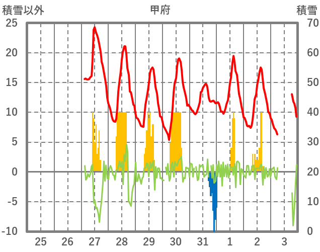 | 日 | 時 | 気温 | 降水 | 風向/風速 | 日照 | 積雪 | 降雪 |