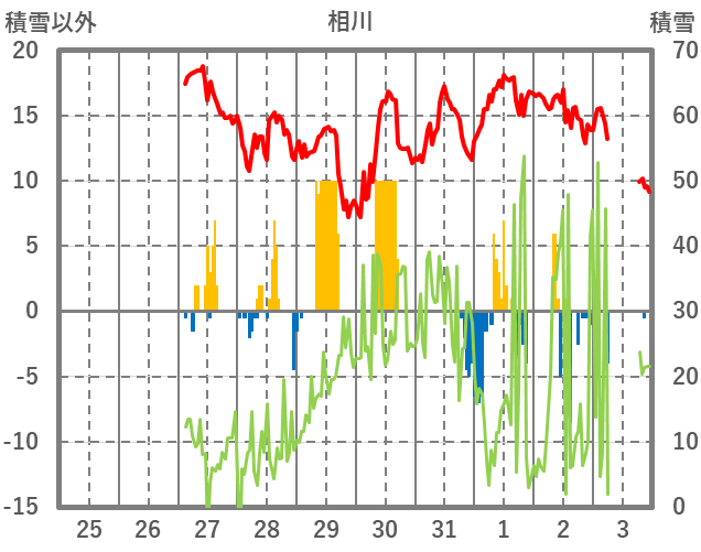 | 日 | 時 | 気温 | 降水 | 風向/風速 | 日照 | 積雪 | 降雪 |
