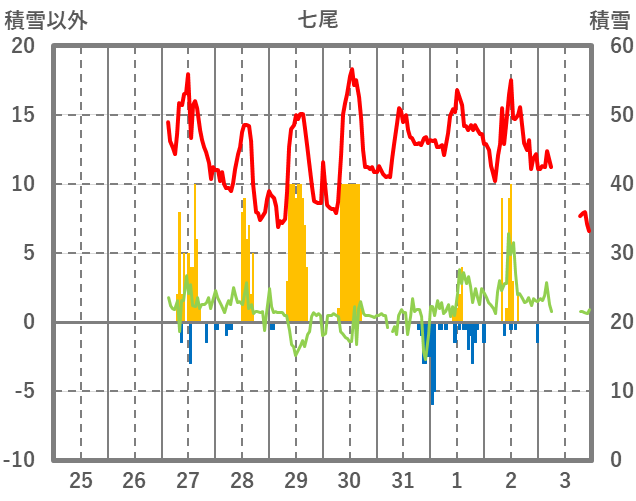 | 日 | 時 | 気温 | 降水 | 風向/風速 | 日照 | 積雪 | 降雪 |