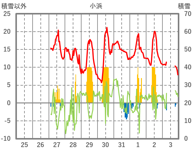 | 日 | 時 | 気温 | 降水 | 風向/風速 | 日照 | 積雪 | 降雪 |