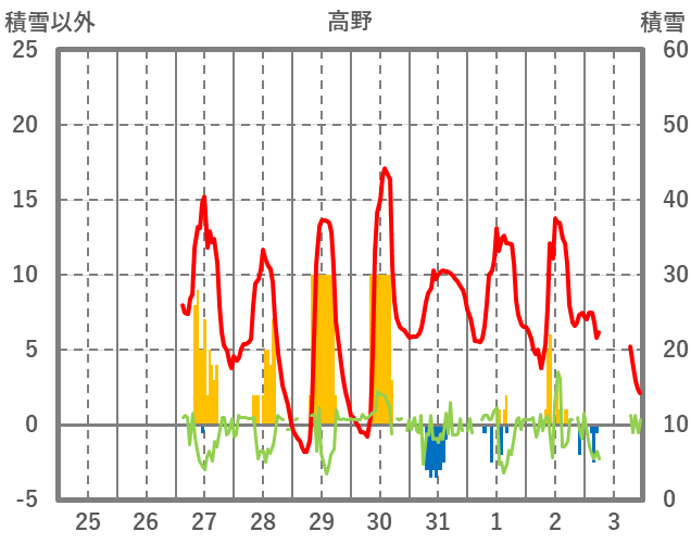 | 日 | 時 | 気温 | 降水 | 風向/風速 | 日照 | 積雪 | 降雪 |