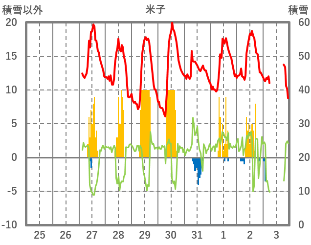 | 日 | 時 | 気温 | 降水 | 風向/風速 | 日照 | 積雪 | 降雪 |